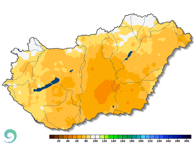 A 2025. évi csapadékösszeget az 1991-2020-as normállal összevetve elmondható (10. ábra), hogy északnyugaton (Győr-Moson-Sopron vármegye) és északon (Borsod-Abaúj-Zemplén vármegye) voltak átlagosan csapadékos területek, míg az ország belseje felé egyre nőtt a csapadékhiány. A legnagyobb anomália a Tiszántúlon és a Duna-Tisza közének déli részén jelentkezett, többnyire a megszokott mennyiség 60-70%-a hullott, de nagyobb összefüggő foltokban előfordult, hogy a normálnak csak az 50-60%-a érkezett.