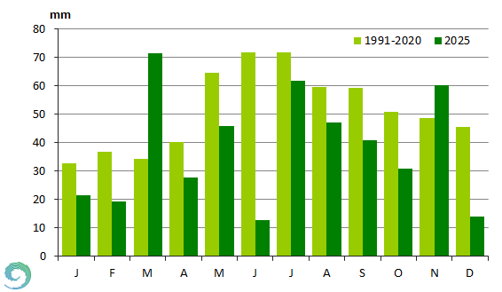 Havi csapadékösszegek 2025-ben és az 1991-2020-as átlagértékek (mm) (homogenizált, interpolált adatok alapján)