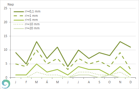 2025-ben 68 napon haladta meg a csapadék mennyisége az 1 mm-t, ami 19 nappal kevesebb az 1991-2020-as átlagnál. A szokásos éves menet (13. ábra) szerint májusban kellene a legtöbb 1 mm csapadék feletti napot detektálnunk, melyet a június és a július követ. 2025-ben a május kicsit, a június viszont nagyon elmaradt az átlagtól, 8 helyett 3 ilyen nap adódott, a júliusi érték pedig 1 nappal volt kevesebb a megszokottnál. Két hónapban volt több 1 mm-t meghaladó csapadékú nap a megszokottnál, márciusban 4-gyel, novemberben 1-gyel több adódott. Nem csak a nyári időszakban kaptunk az 1991-2020-as normálnál alacsonyabb értékeket: februárban és októberben 7 helyett 4, míg decemberben 8 helyett 3 ilyen nap jelentkezett.