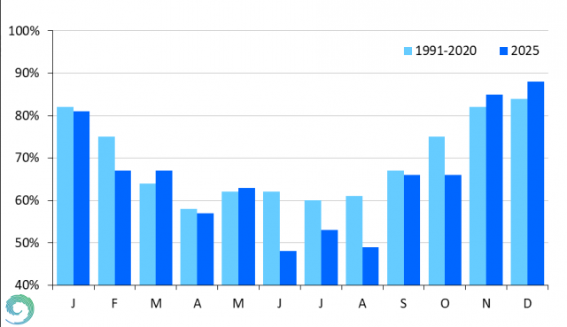 2025-ben Budapest Pestszentlőrincen januárban a relatív nedvesség értéke az 1991-2020-as normál közelében alakult. Februárban viszont a szárazság miatt 89%-a volt csak a megszokottnak. A csapadékos, de a megszokottnál melegebb március következtében az átlagnál 5%-kal magasabb volt a relatív nedvesség értéke. A tavasz további részében teljesen átlagos értékek adódtak. Az év során júniusban adódott a legnagyobb mértékű negatív irányú eltérés, a száraz június 23%-kal csökkentette a relatív nedvesség értékét. A többi nyári hónapban és októberben is közel 20%-kal alacsonyabb értékek adódtak. Szeptemberben a megszokottól alig tért el az érték (99%). így teljesen megfelelt az 1991-2020-as normálnak. Az év utolsó két hónapjában 4-5%-kal magasabb volt a relatív nedvesség, ami összefügg azzal, hogy novemberben az átlag felett volt a csapadék mennyisége. (25. ábra).