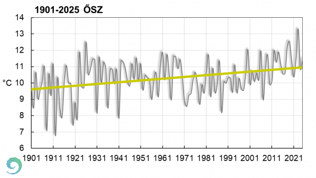 Az évszak középhőmérséklete 1,8 °C-kal marad el az eddigi legmelegebb, 2023-as ősztől. A többi évszakhoz hasonlóan az őszi középhőmérséklet idősora is melegedést mutat 1901 óta a lineáris trendbecslés alapján (4. ábra). Az évszakos középhőmérséklet országos átlagának változása a XX. század kezdete óta +1,3 °C.