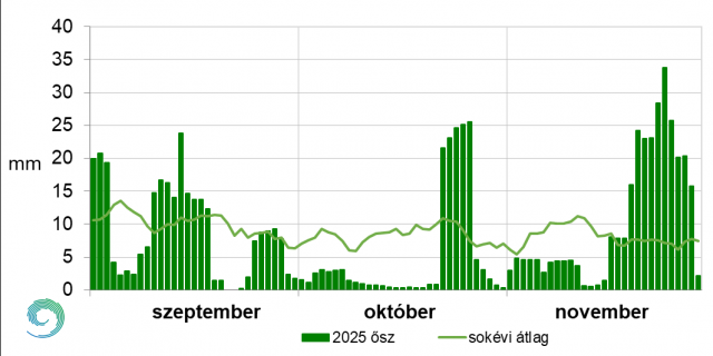 A 2025-ös ősz napi középhőmérsékleteit és a sokéves átlag értékeit a 9. ábrán mutatjuk be. Az évszak 91 napjából 52 napon a normálnál magasabbak voltak a napi átlaghőmérsékletek. Szinte az egész szeptember melegebbnek adódott a megszokottnál, 5-e lett az évszak legmelegebb napja, amikor 23,7 °C volt a napi középhőmérséklet. Ezen a napon mértük ősszel a legmagasabb hőmérsékletet (35,1 °C) is Körösladányban és Körösszakálon, ami egyben új országos napi melegrekord. A normáltól való legnagyobb pozitív eltérés 22-én adódott, több, mint 7 fokkal volt melegebb az átlagnál. 25-én kezdődött egy erőteljes lehűlés, mely hideg periódus október 8-ig tartott. Október 3-án éltük át a legnagyobb negatív anomáliát: országos átlagban 6,2 °C-kal maradt el a hőmérséklet az 1991-2020-as értéktől. Ezt követően a sokéves átlagnak megfelelően alakult időjárásunk, majd két hidegebb nap (19-20) után melegedés volt megfigyelhető. A hónap végén és november elején már 4-6 fokkal mértünk magasabb hőmérsékletet, mint ilyenkor az szokásos. November közepén a Kárpát-medencét több napig egy hidegpárna töltötte ki, majd melegedés kezdődött, mely 17-én tetőzött. Viszont az ekkor érkező markáns hidegfront mögött már sarkvidéki eredetű hideg levegő áramlott hazánk fölé. Az ősz leghidegebb napján, 23-án fagypont alá süllyedt a napi középhőmérséklet (-0,2 °C).