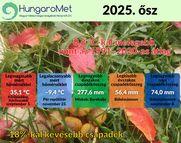 A HungaroMet Nonprofit Zrt. mérései alapján a 2025-ös ősz középhőmérséklete országos átlagban 0,8 fokkal meghaladta az 1991–2020-as éghajlati normált. A meleg szeptembert követően az átlag körül alakult a hőmérséklet. Csapadék tekintetében az év utolsó évszaka is száraz volt, csak novemberben hullott a szokásosnál több csapadék.